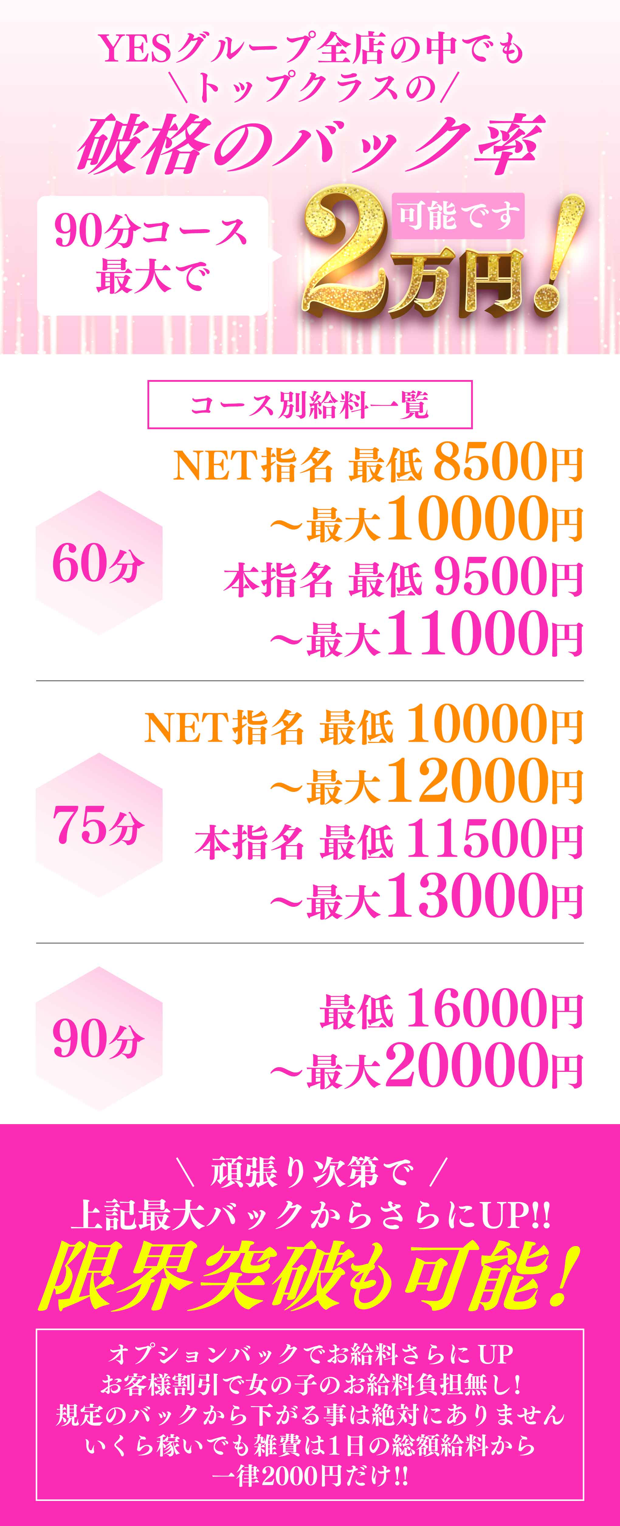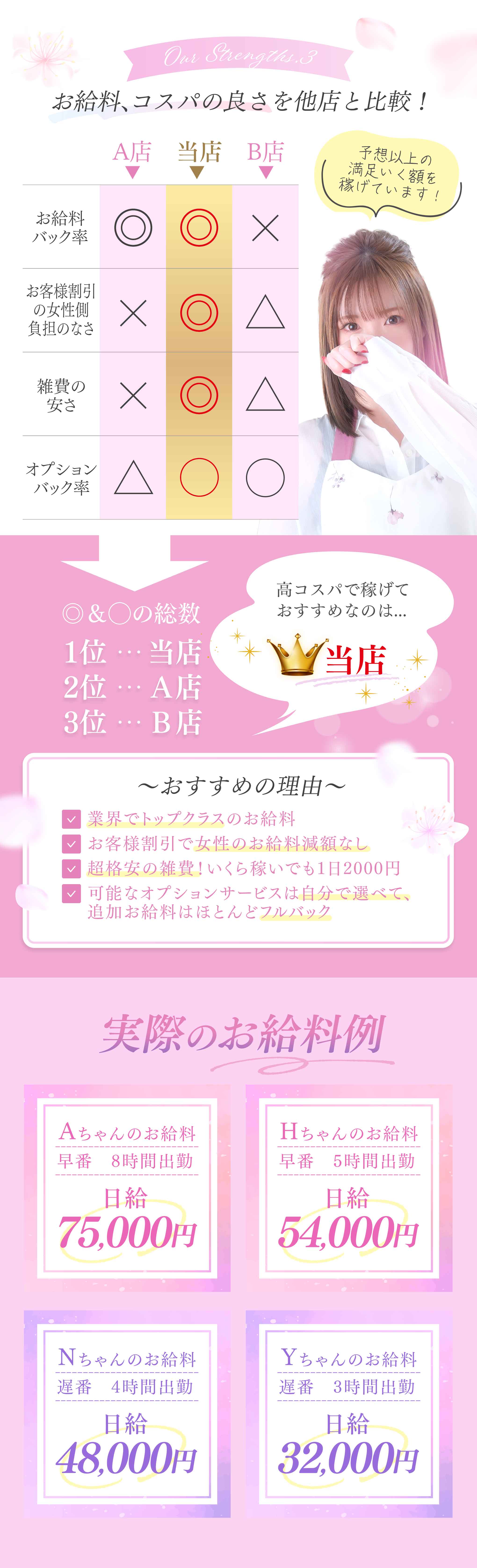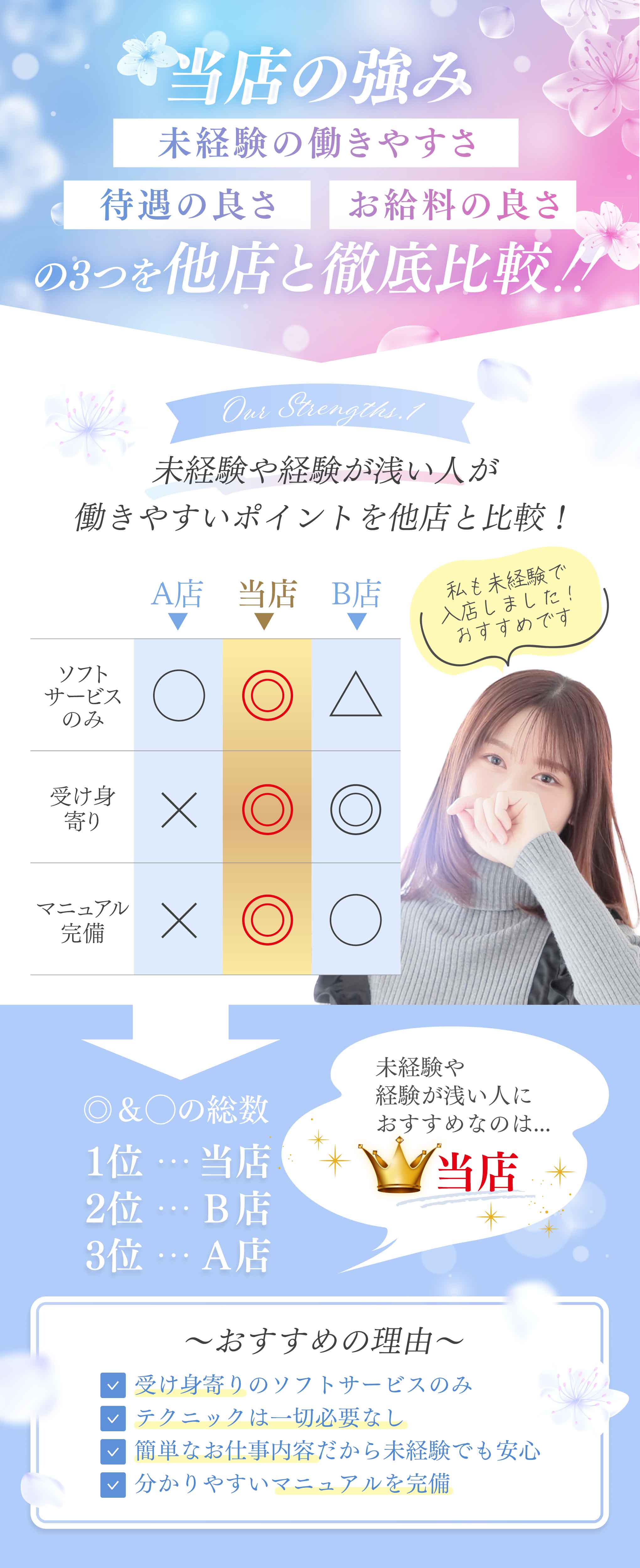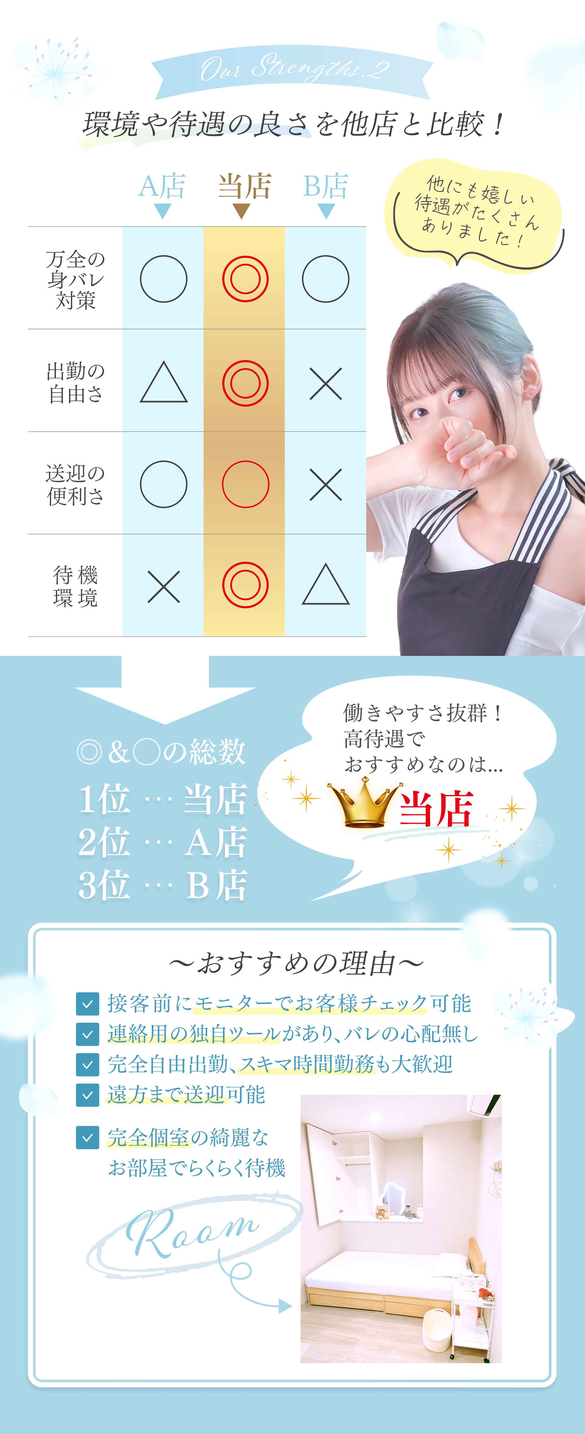 | ■最低保証制度あり! ■完全自由出勤 ■週1日、月数回の勤務でOK ■1日3時間以上からOK ●完全日払い(明細を発行の明朗会計) ●ノルマや罰金一切なし ●完全個室待機 ●安心・安全の衛生管理 ●提携医療機関あり ●生理休暇あり ●制服無料貸与 ●アリバイ対策(接客前モニター確認あり) ●掛け持ちOK(他店との違いを確かめて!) ●入店・退店いつでもOK(強要や引止め一切なし) ●寮完備 ●送迎あり ◆未経験大歓迎 ◆学生(専門、大学)、昼職との掛け持ち、すきまバイト大歓迎 |