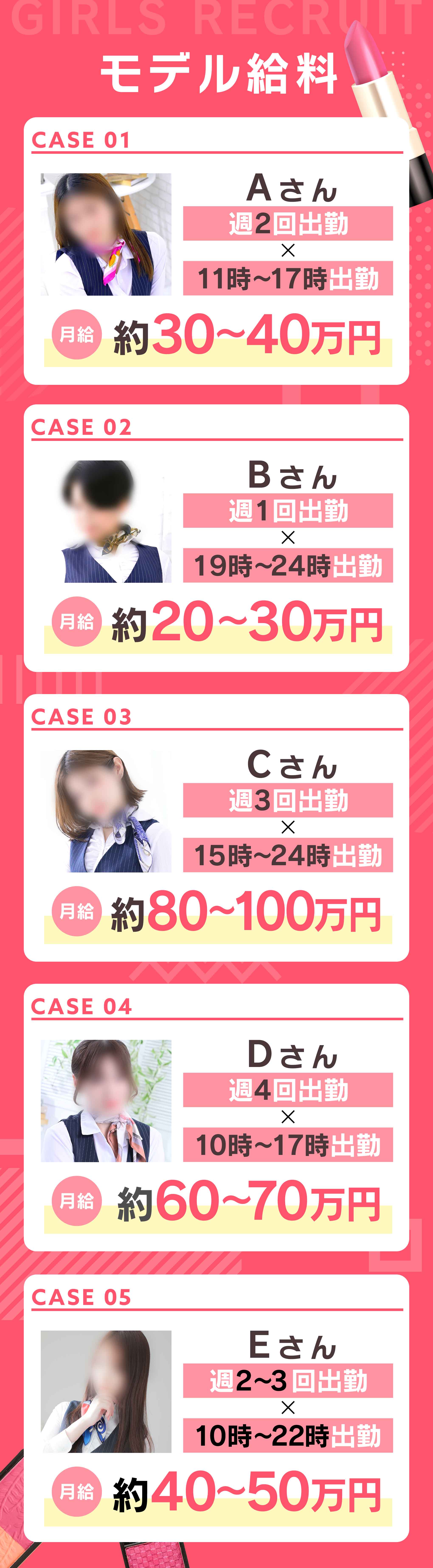 | 10:00~17:00:25,000円~50,000円 17:00~24:00:30,000円~55,000円 ※お仕事している方の平均から算出しております。 ※勿論、勤務時間やお客様の付かれる本数によりお給料がUP致します。 |
