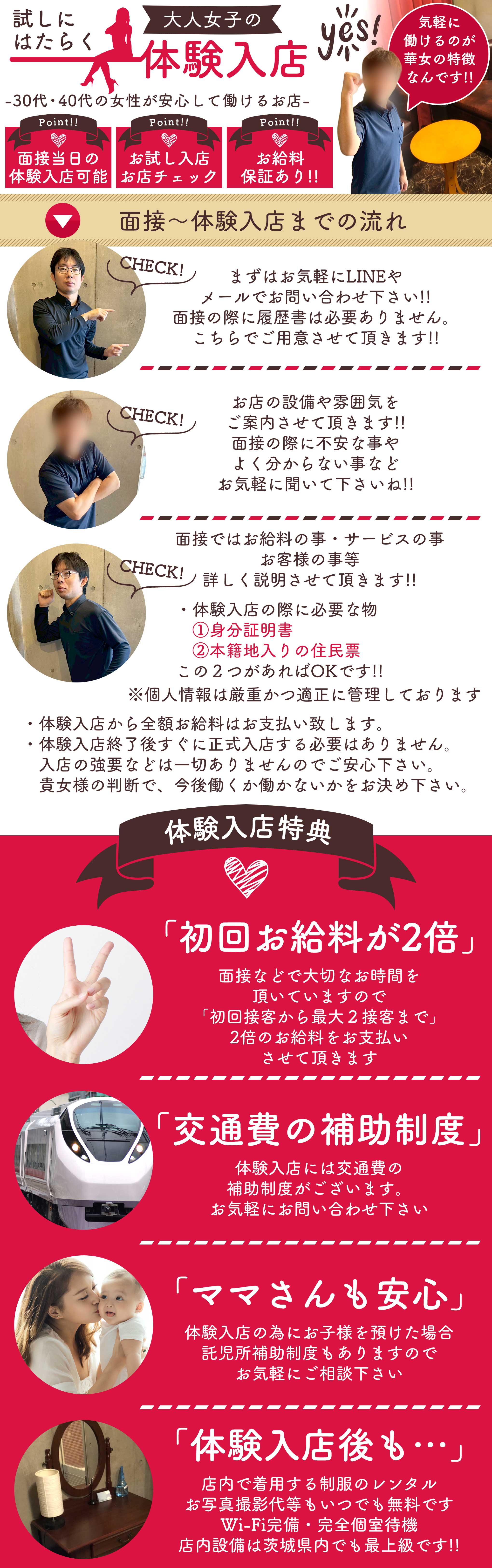 体験入店が終了しましたら、正式に働くか働かないかは、貴女の判断にお任せします。体験入店をしたからと言って、強制で働かせる事は絶対にありませんので、ご安心下さい。もし、体験入店をしまして大丈夫であれば、正式入店となります。