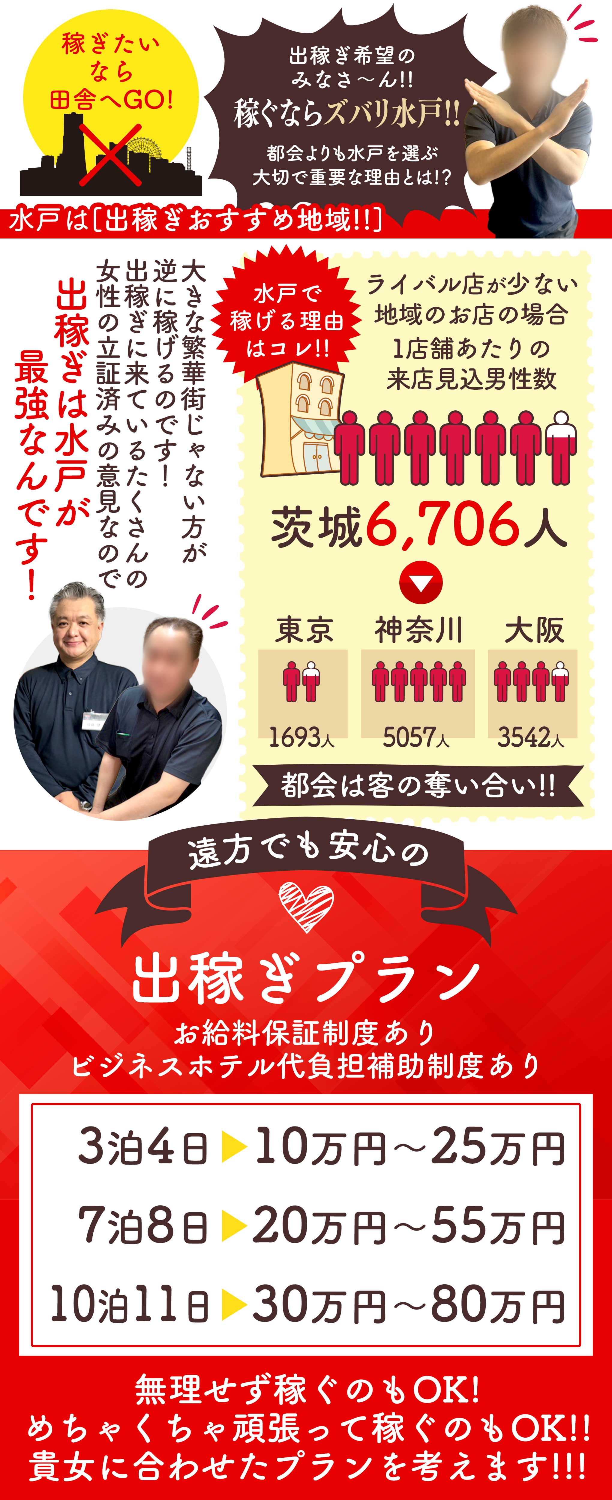 まず、出稼ぎで一番心配な事は、せっかく行ったのに稼げるのか。。。そこが一番不安ですよね!安心して下さい!!水戸には店舗型風俗店、デリヘルが大きな都市と比べると断然に少ないので、ズバリ!稼げます!!大きな繁華街と比べると断然に風俗店が少ないのが水戸の特徴でもあります。