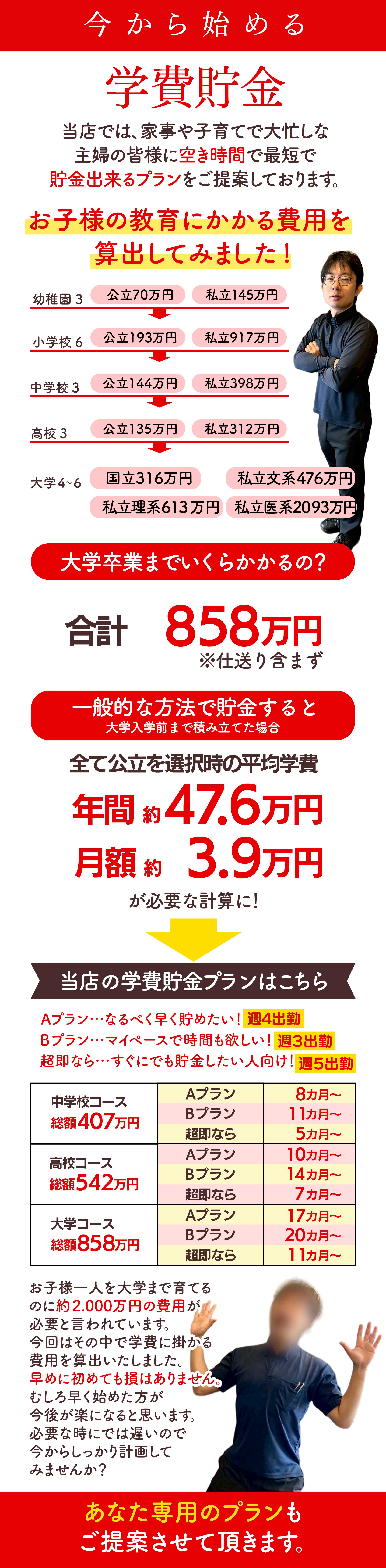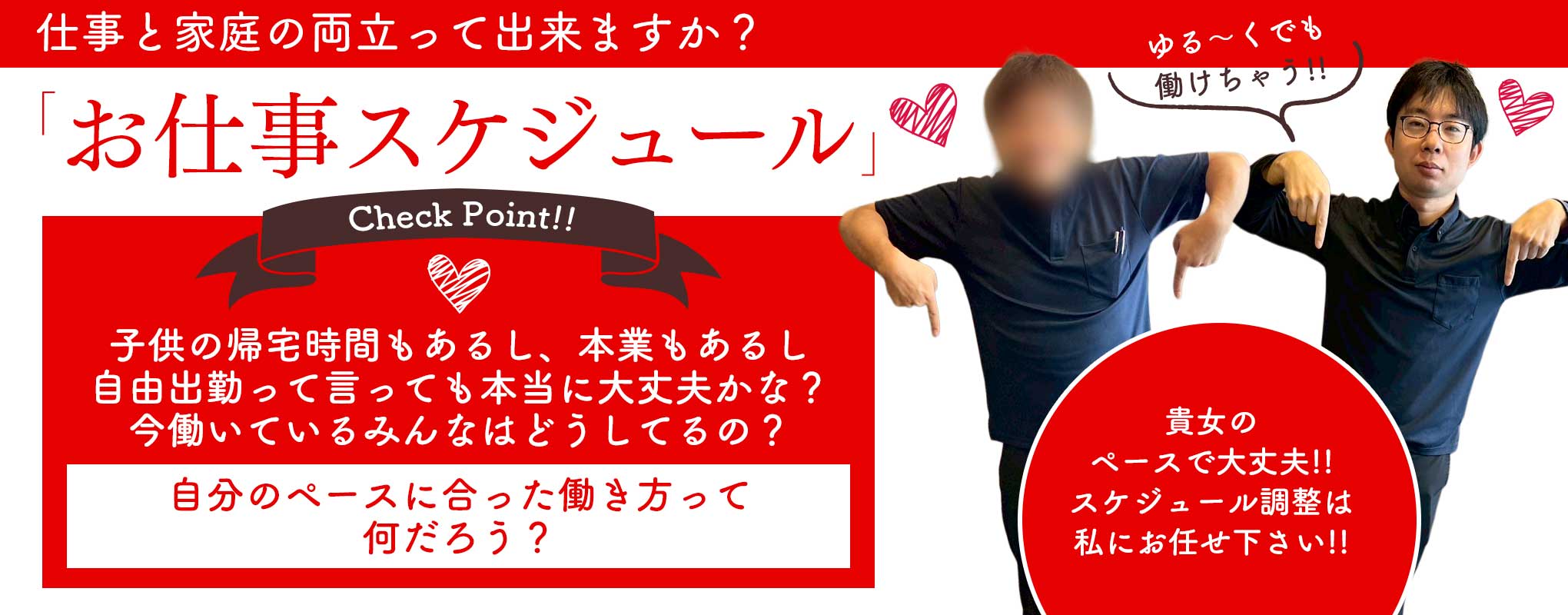 週1日でも、月1日でも勿論大丈夫です。 10:00~24:00の間でご都合の良いお時間でお仕事が可能でございます。 2~3時間の短いお時間でも勿論大丈夫ですのでお気軽にご相談下さいませ。 |