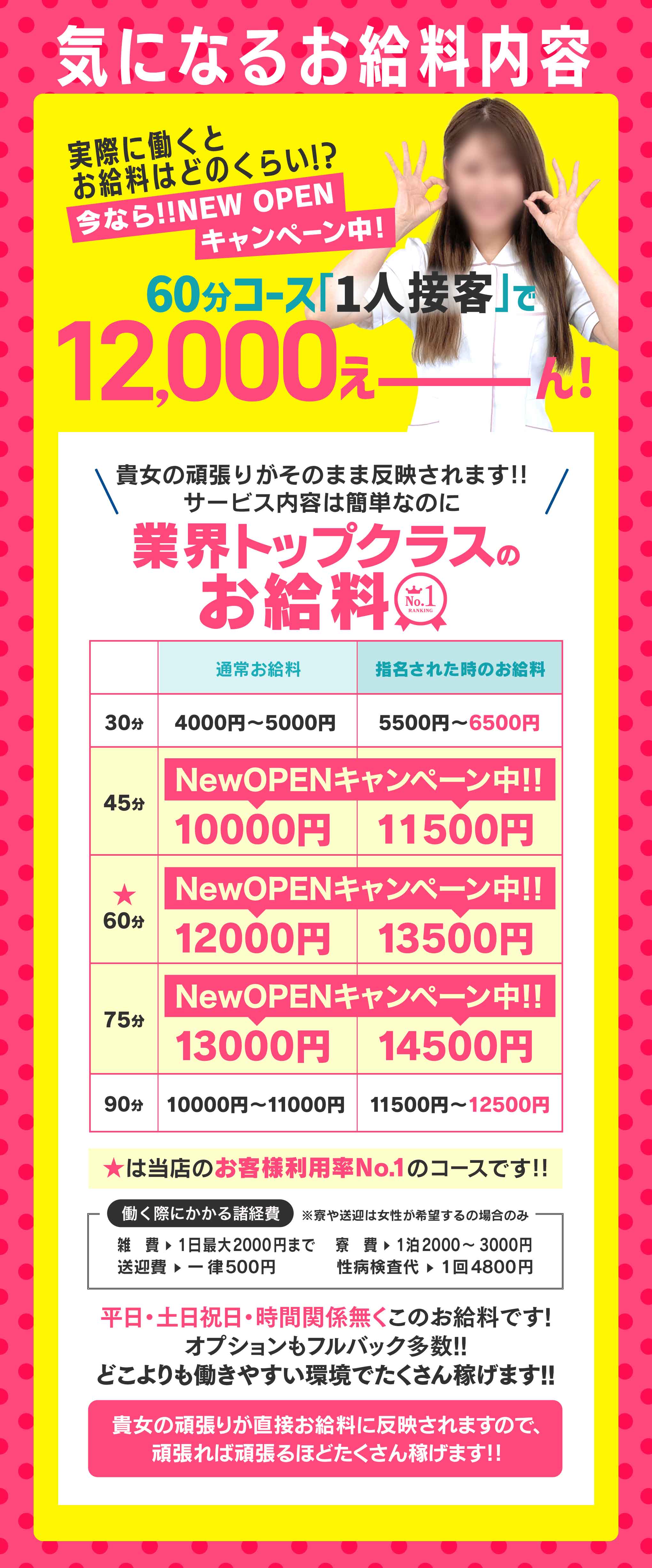 女の子の勤務回数や勤務時間はご自由にお決め下さい!既婚者の方ですと、どうしても夜が出られない、お子様がいらっしゃる方で、短時間しか出られない、様々な理由があると思いますので、働ける時で大丈夫ですので、ご希望を遠慮なく言って下さい!