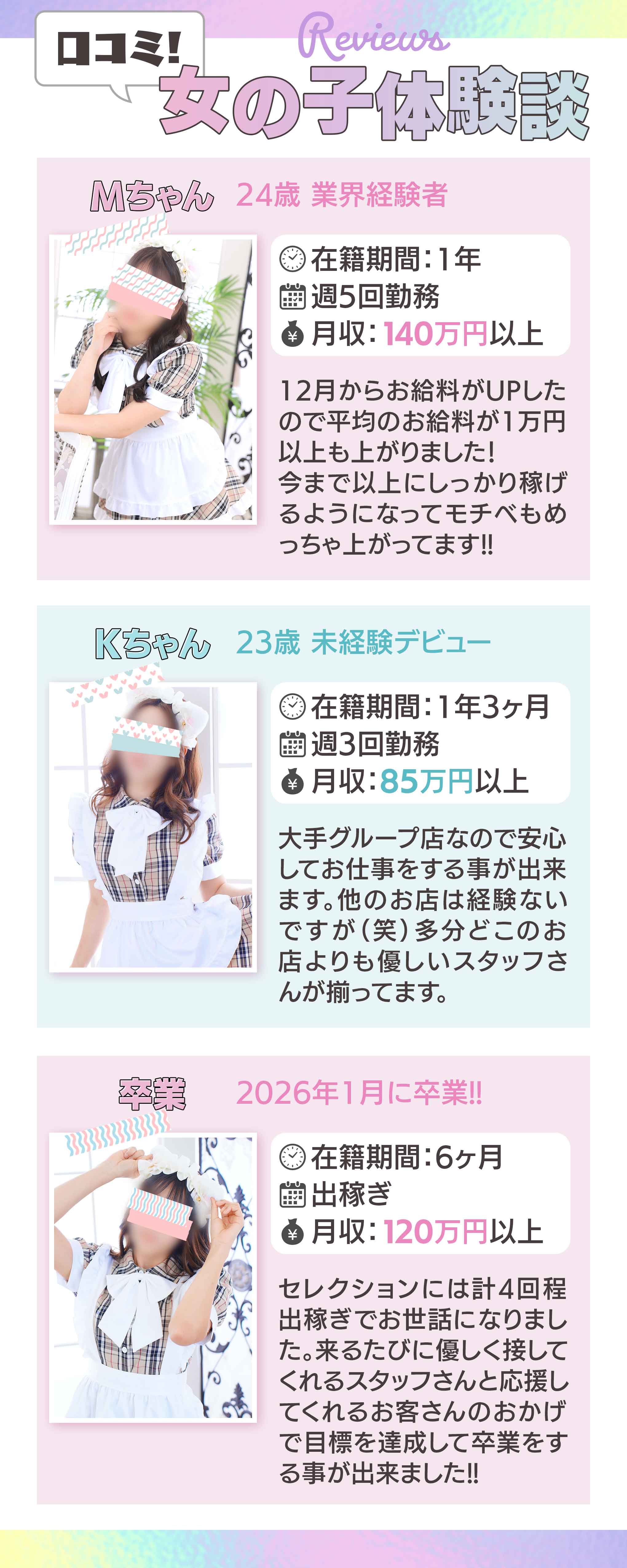 イエスグループは登録制やフランチャイズ制のチェーン店ではなく、すべて管理体制の確立された直営店です。 店舗によってコンセプトは多様ですが、店舗独自の判断で女の子の困る事や嫌がる事をするような事は禁止しています。 各地域には、撮影スタジオ・専属メイク・専属カメラマンを配置しております。 平成7年創業時から、ただの風俗業とは考えずにお客様に満足して頂けるサービス業と考え、一生の仕事として、真面目に取り組んでます。