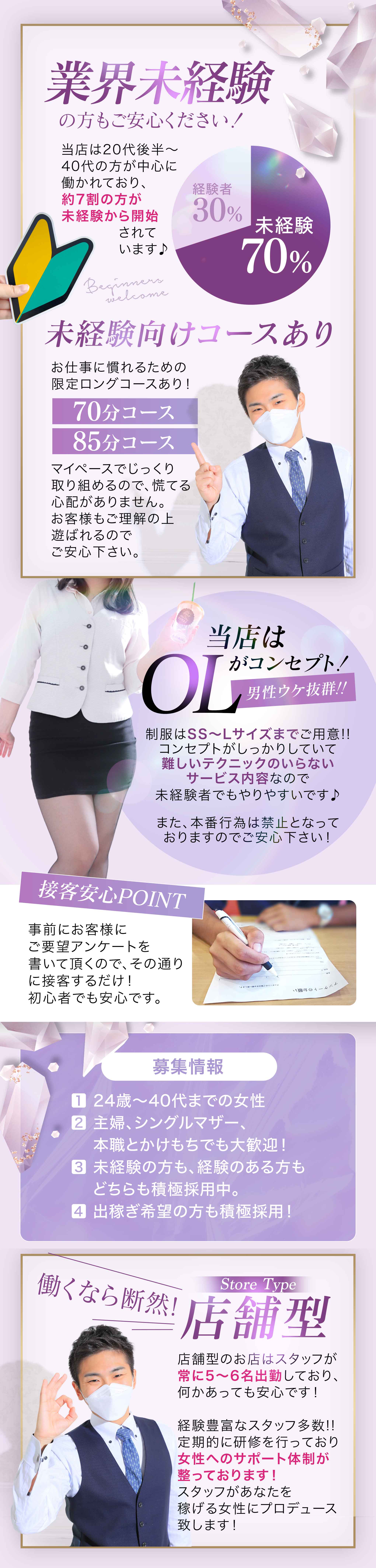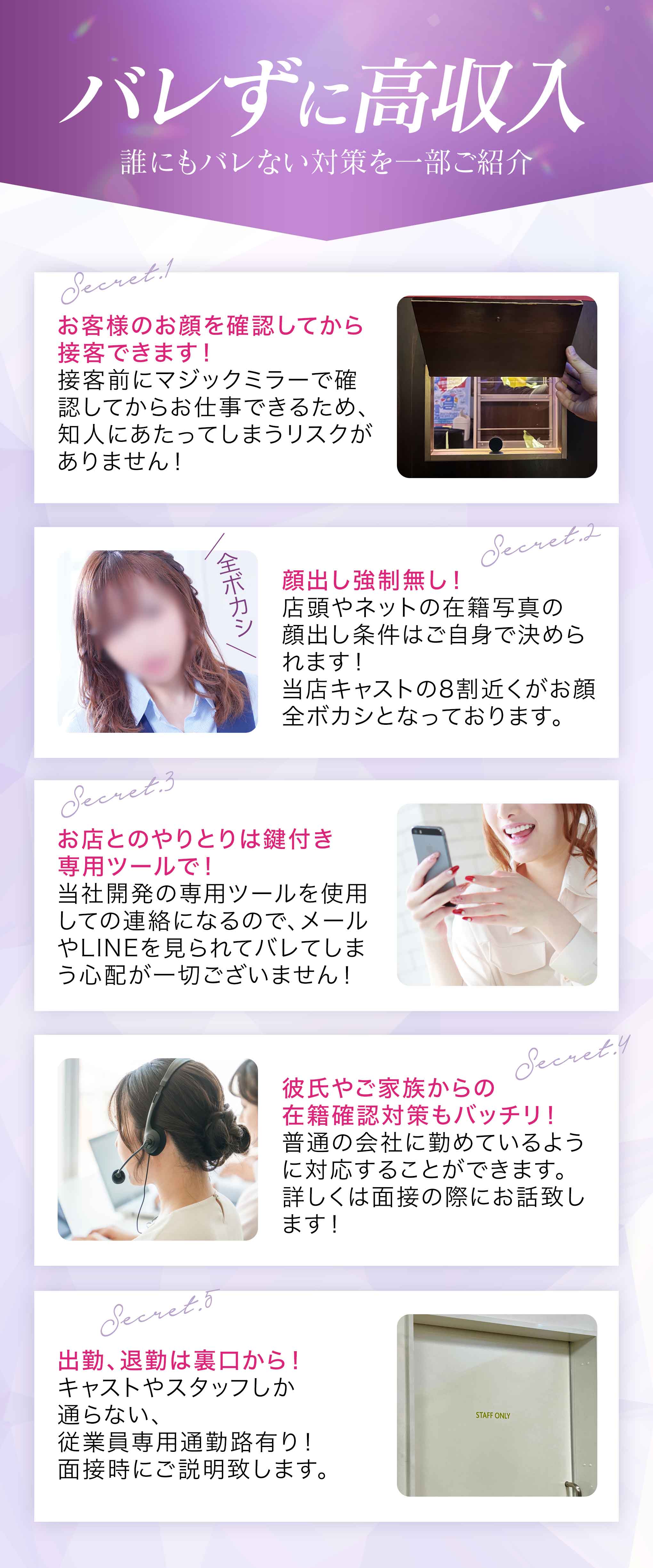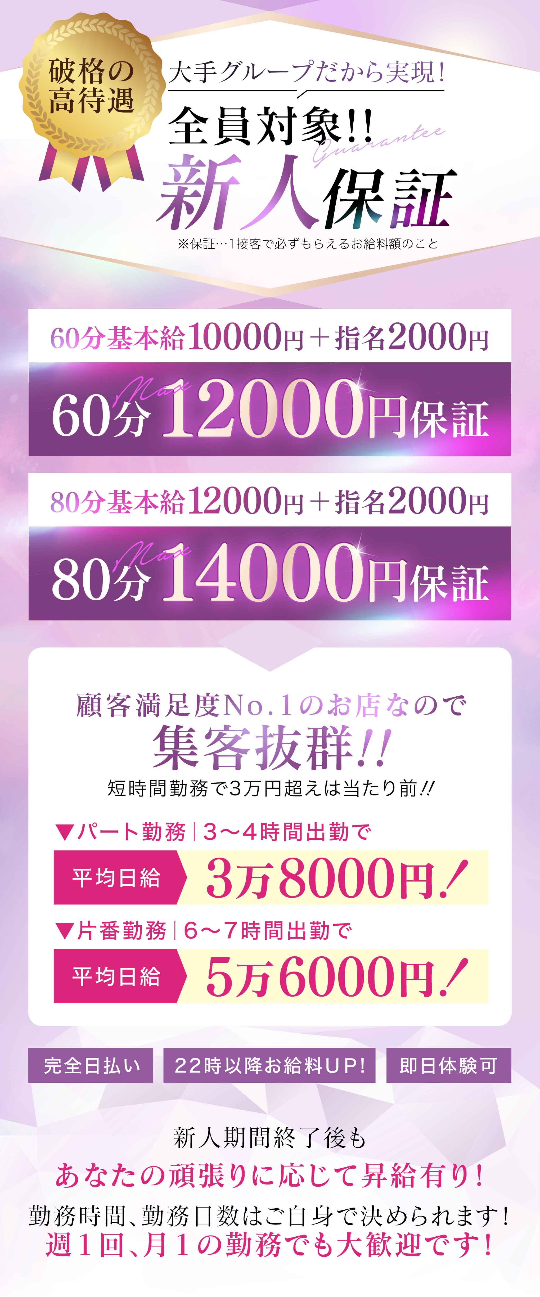| 学生・主婦、既婚者・未経験者・経験者・掛け持ちも大歓迎。 容姿やスタイルで判断はしません。タトゥー・妊娠線ある方も活躍出来ます。 前向きな方を全力でサポート出来る体制が整ってます。 とにかく稼ぎたい子!大募集! ※18歳未満(高校生を含む)の応募はお断りします。 |