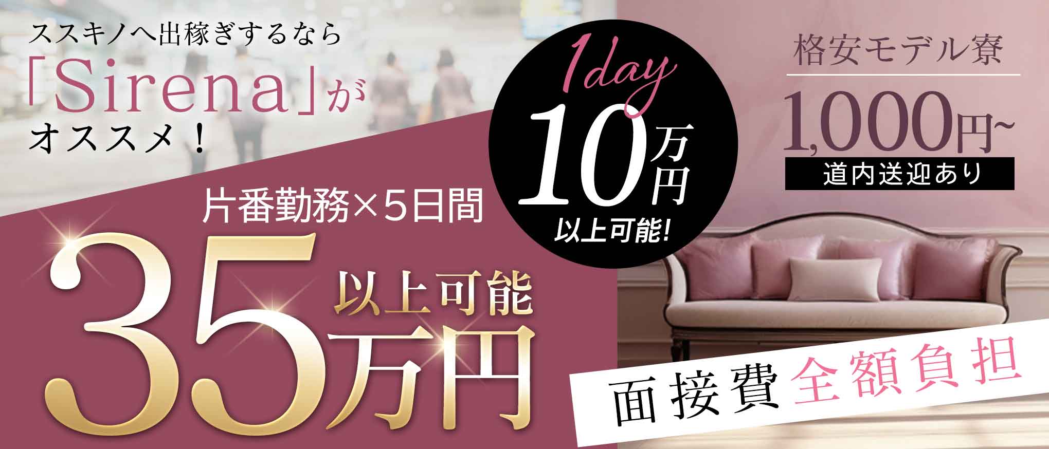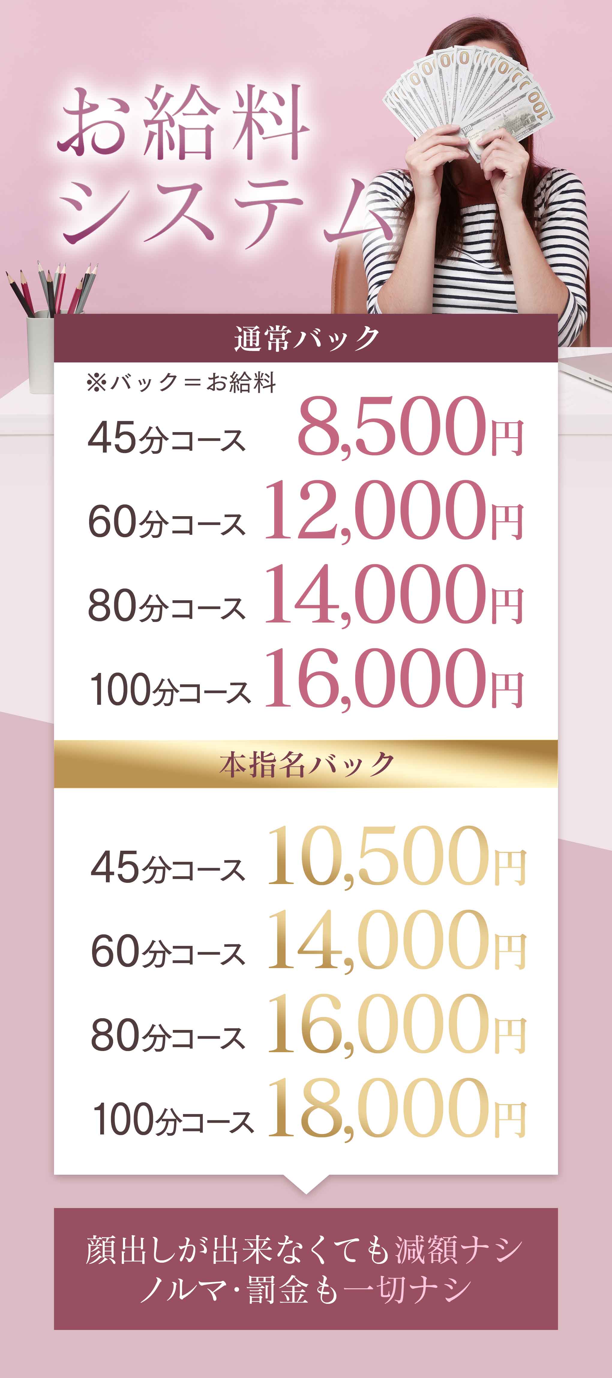 9:00~17:00 35,000円~60,000円 17:00~24:00 35,000円~70,000円 ※お仕事している方の平均から算出しております。 この金額以上に稼いで頂く事も可能です。 |