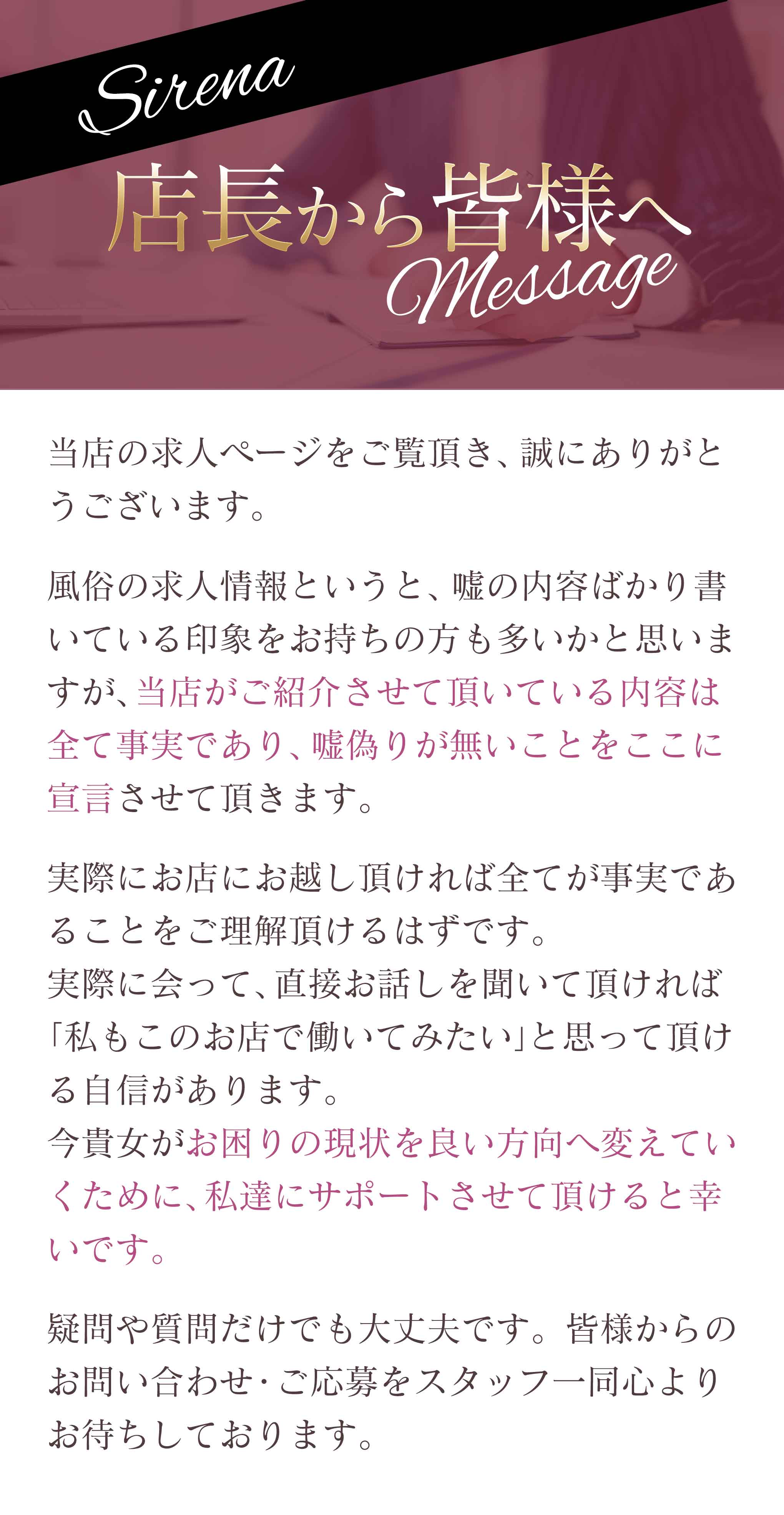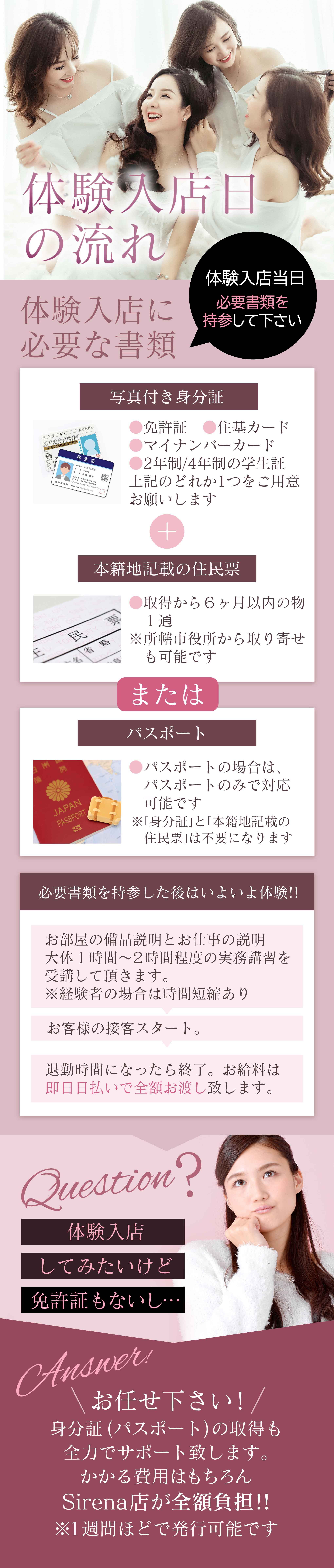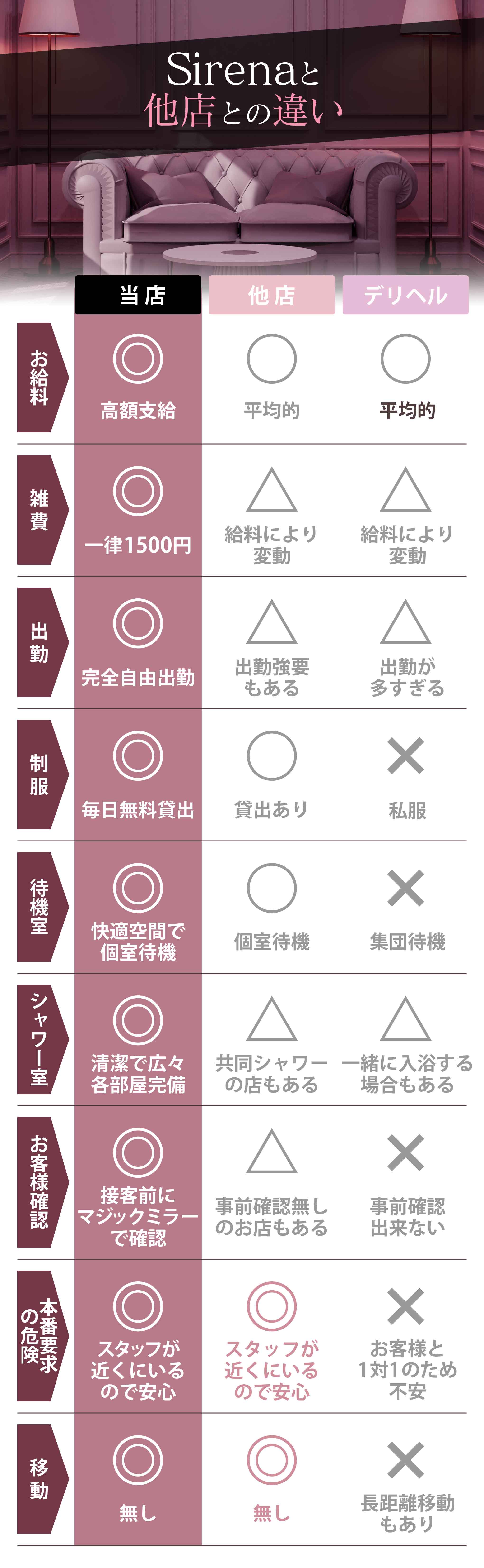 週4日~週6日のレギュラー出勤 週1日~週3日のアルバイト出勤 月1日~2日などの不定期出勤 大型連休や、年末年始だけの出勤や ○万円稼ぐ迄の出勤などでも大歓迎です。 |