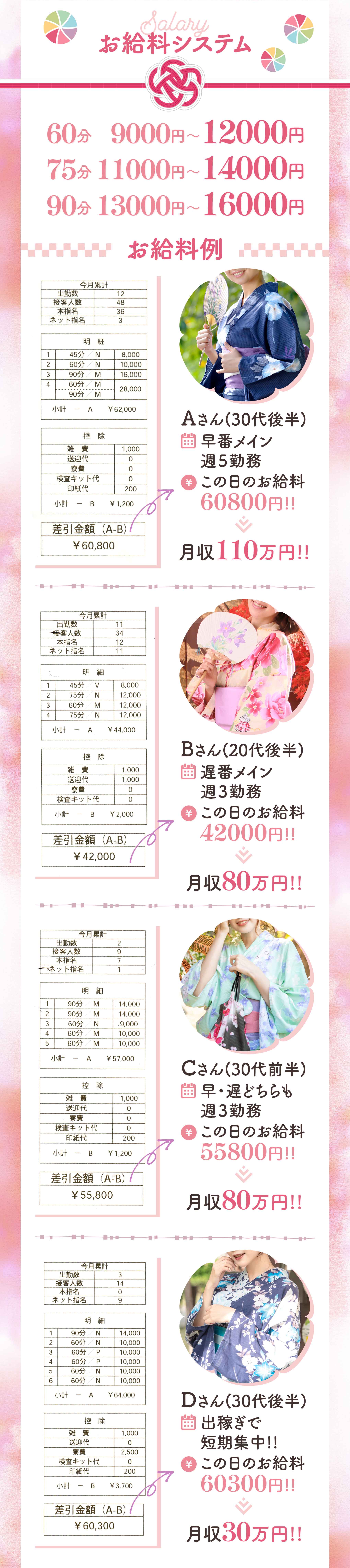 | 日給35.000円以上 月給80万円以上 ◎全額日払い制◎ お店から引かれる物 1.雑費 稼ぎから1,000円徴収します。 内訳:クリーニング・備品関係 2.遅番の送迎を利用される方は 500円頂いております。 |