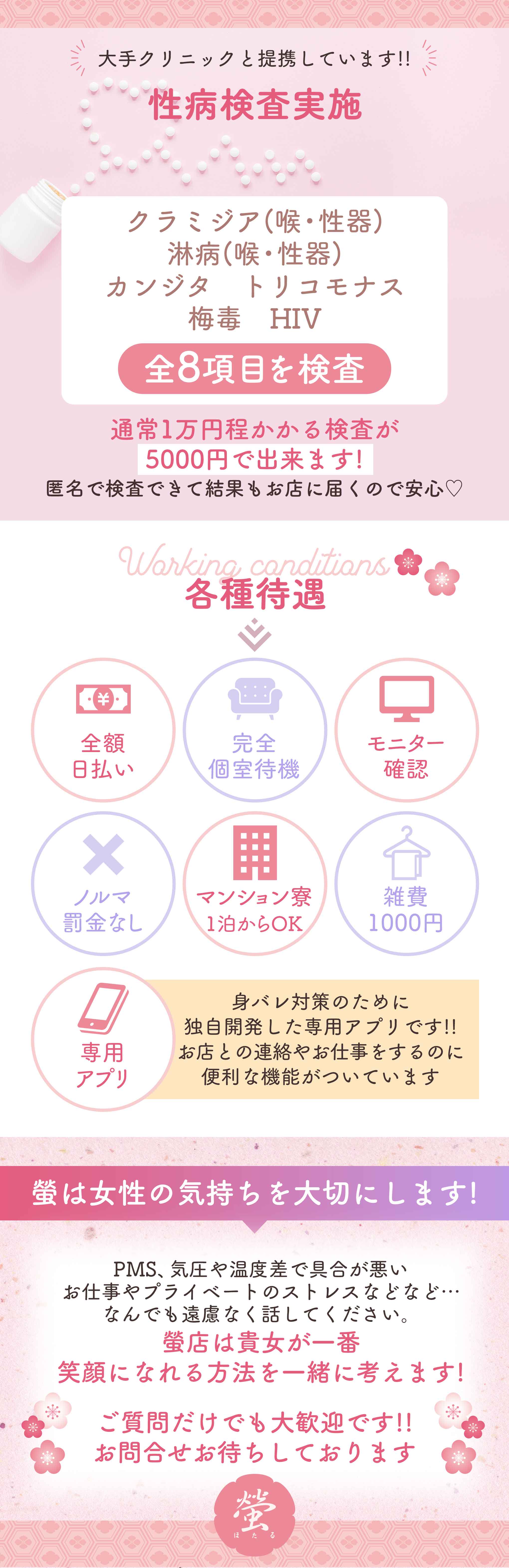 | 月1日・週1日からOK 完全自由出勤 仕事・学校があり忙しい方でも大歓迎です! ◎勤務初日の内容◎ 初日の持ち物ですが、【飲み物・軽食】はご用意下さい。 ※最悪忘れても我々が買いに行きますのでご安心を★ 1.入店書類の完成 2.当店のシステムの登録【写メ日記等】 3.在籍写真の撮影 4.お勉強【お店のサービス内容等を勉強致します。】 5.お時間があれば、実際のお客様を接客致します☆ 一日目は大変緊張もしますが、スタッフが丁寧にしっかり解るまで 教えますし、ちゃんと側におりますので、ご安心下さい^^ |